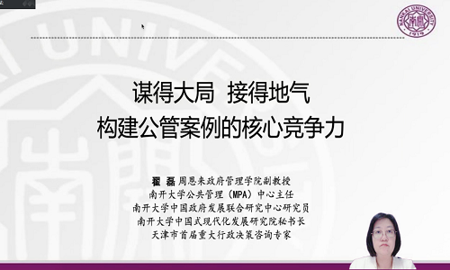 翟磊副教授围绕“谋得大局 接得地气 构建公管案例的核心竞争力”主题,从案例诞生的两种路径、案例的核心竞争力模型、差异化的案例叙事三个方面,结合实际案例作了充分的参赛指导。她深入分析了选题领域、资料来源、评委视角、理论选择、案例特色五位一体的竞争力框架,突出了“问题意识”的重要性。自由交流环节,翟磊副教授就案例大赛有关问题进行了答疑解惑。