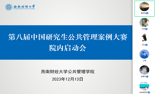为进一步推动公共管理案例教学与案例开发,全方位提升研究生创新实践能力,2023年12月13日,由MPA教育中心组织的第八届中国研究生公共管理案例大赛院内启动会在线上举行。会议邀请了南开大学周恩来政府管理学院MPA教育中心主任翟磊作专题讲座。会议由MPA教育中心办公室主任黄艳玲主持,开云kaiyun官方网站百余名师生参加了此次会议。