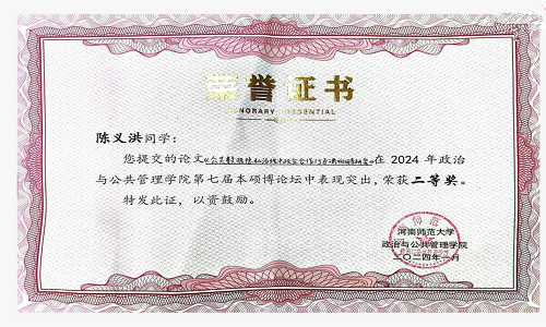 2024年1月21日,在河南师范大学政治与开云kaiyun官方网站主办的第七届本硕博牧野论坛中,开云2021级行政管理系硕士研究生陈义洪获二等奖。