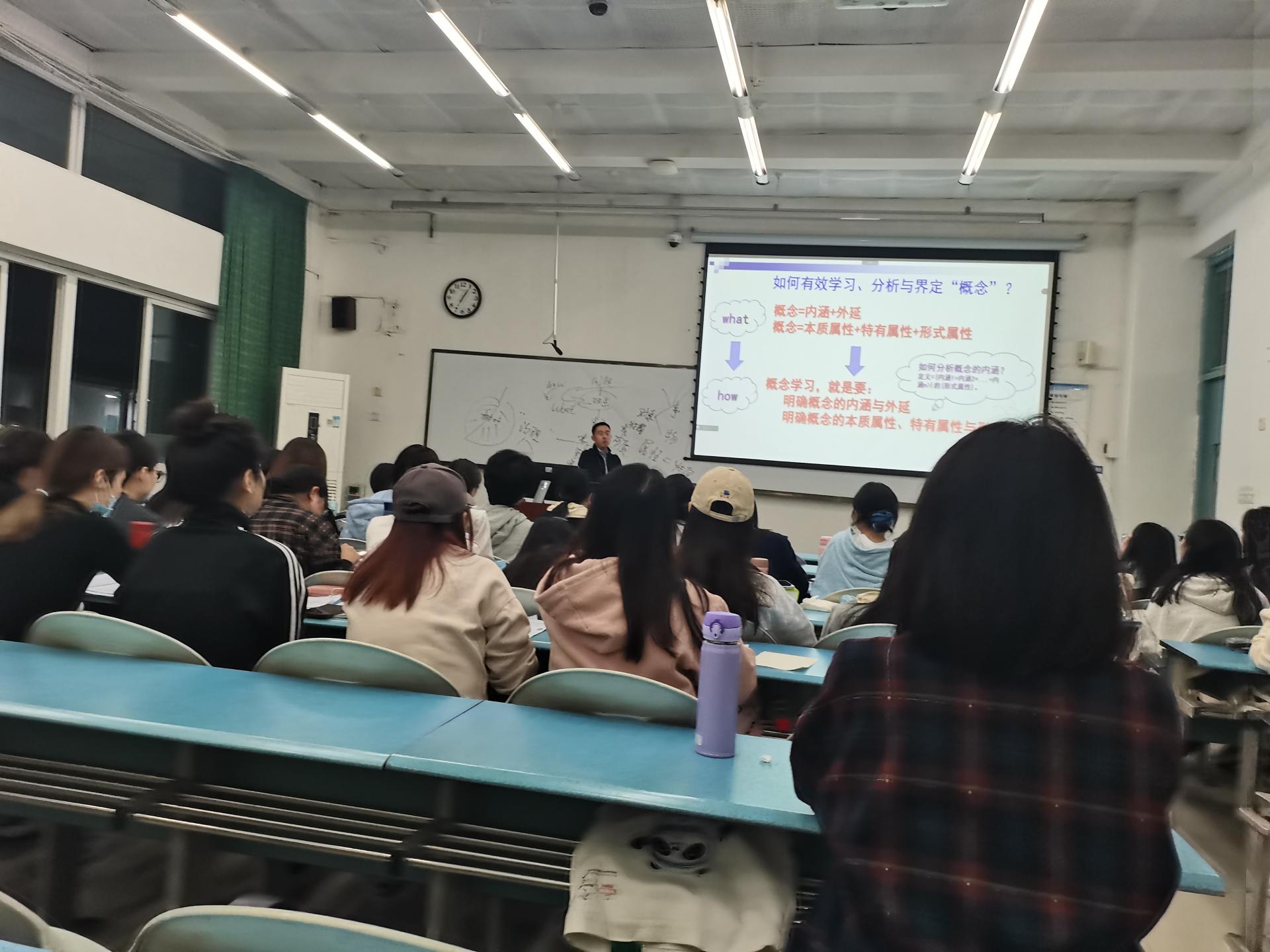 在课堂教学中,陈朝兵老师首先带领学生对前几周的教学内容进行总结回顾,随后通过PPT图文展示与板书相结合的教学方式重点讲授了问题解构逻辑链、概念分析法等课程内容。陈老师鼓励同学们积极表达自己的观点,并对同学们的课堂发言进行精细化点评,帮助同学们进一步提升分析问题的逻辑思维能力。