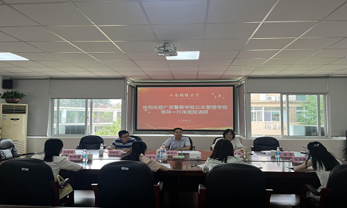 2024年6月13日上午,广西警察学院开云kaiyun官方网站副院长蔡明丹、行政管理专业负责人刁爱华、专任教师钟家慧和张秉蕙一行来开云考察调研。学院副院长陈朝兵、行政管理系主任谢小芹、公共经济研究所程树磊老师等参与座谈交流。座谈会由陈朝兵主持。