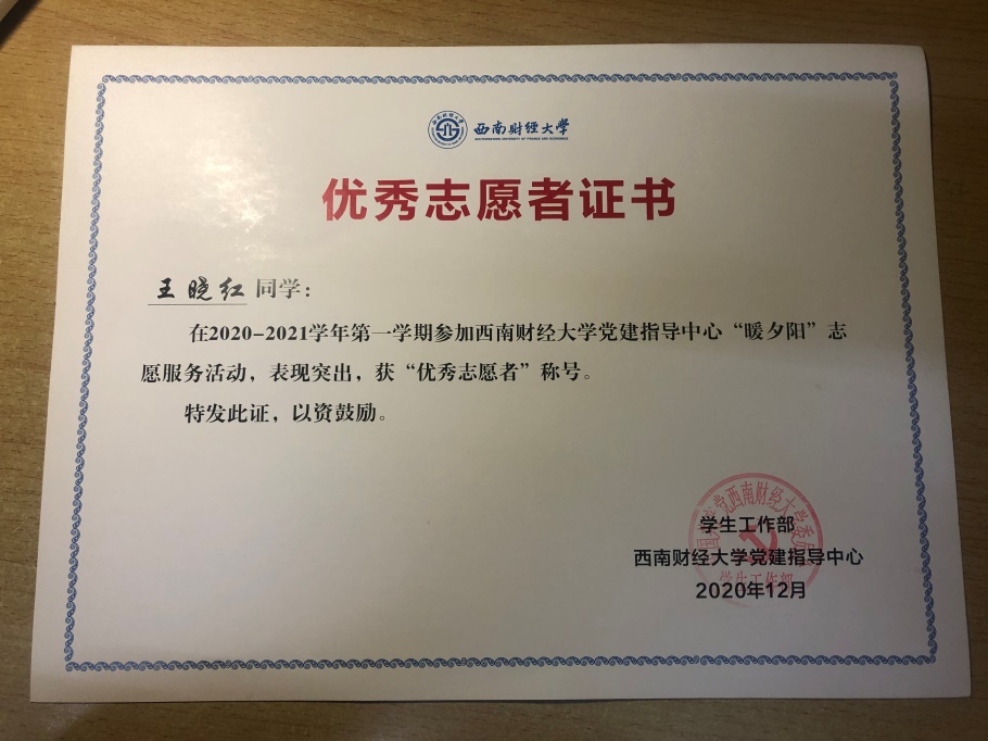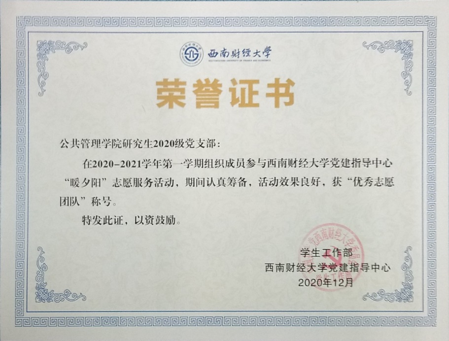本次活动是2020级党支部成功申报开云kaiyun官方网站学生党建指导中心“暖夕阳”志愿服务活动。经学校党建指导中心评审,2020级研究生党支部在本次志愿服务活动中荣获“优秀团队”称号;王晓红同学获“优秀志愿者”称号。