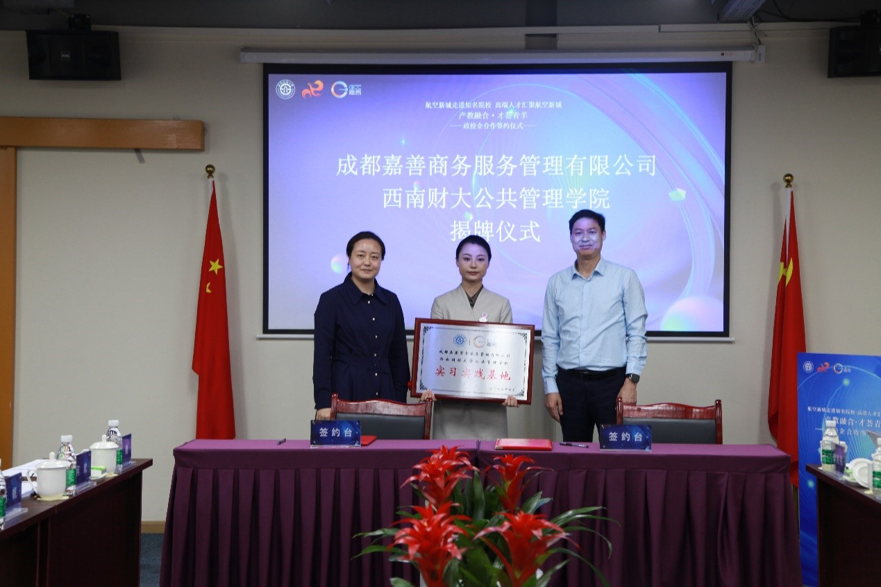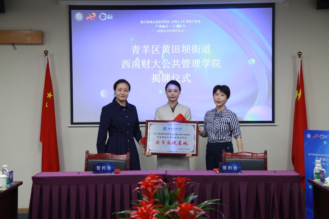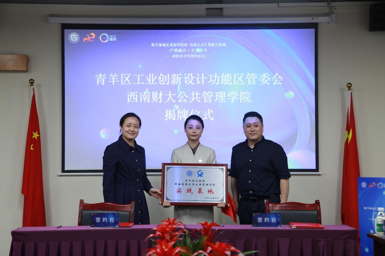 郑良秀代表开云kaiyun官方网站与青羊区工业创新设计功能区管委会、青羊区黄田坝街道和成都嘉善商务服务管理有限公司分别签订合作意向协议,并举行“实践基地”揭牌仪式。随后,与会嘉宾就政、校、企协同育人、科研项目合作、毕业生就业实习等内容进行了深入交流。