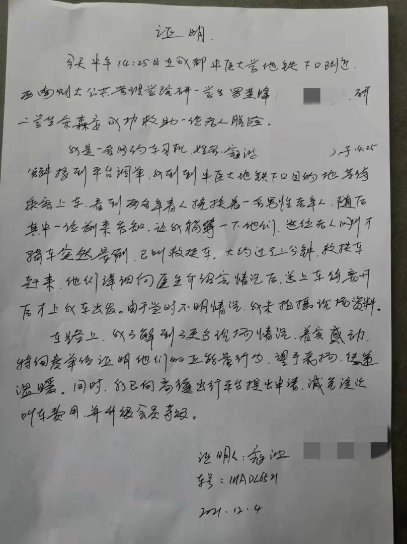 接到两位同学网约车订单的寇波师傅目睹了两位同学救助老人的过程,在送两位同学的过程中又了解到了具体情况,寇波师傅说,他是第一次遇到这样的情况,作为一个志愿者,希望这种正能量的行为可以得到弘扬。因此,他特意手写了一份情况证明书送到学校,希望学校对这两位见义勇为的同学给予表扬。