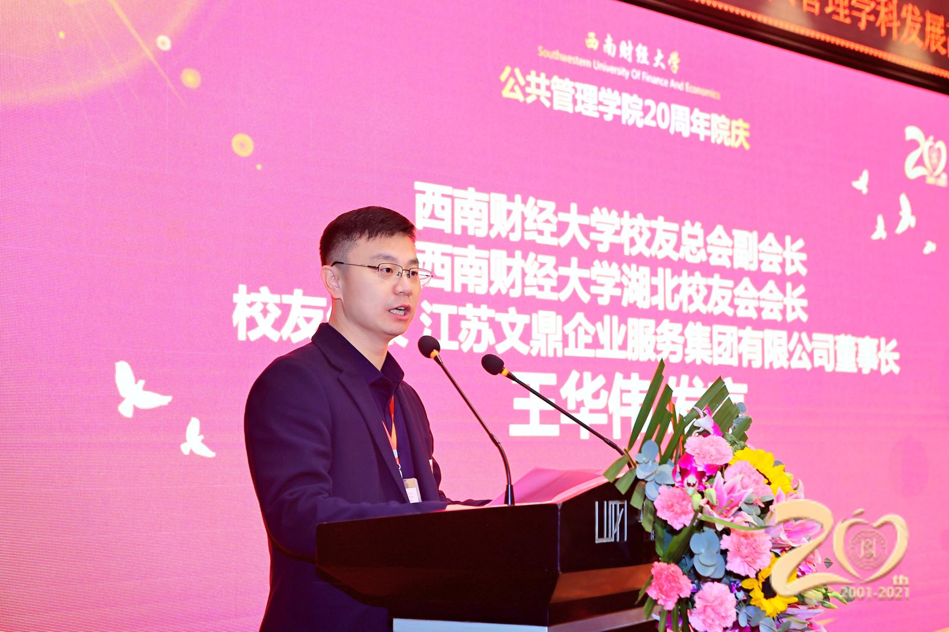 校友代表、江苏企业文鼎服务集团公司董事长王华伟表达了对学院20周年庆的衷心祝福。他在致辞中表示,二十年来,学院不断向好发展,但不变的是严谨务实的院风、争创一流的气魄和赋予给每个学子的情怀。希望西财公管学子饮水思源,满载公管的精神和力量奔赴各行各业,奔赴海内外,践行人才强国战略,实现家国富强梦,奏响时代强音,努力成为新时代的公管娇子!