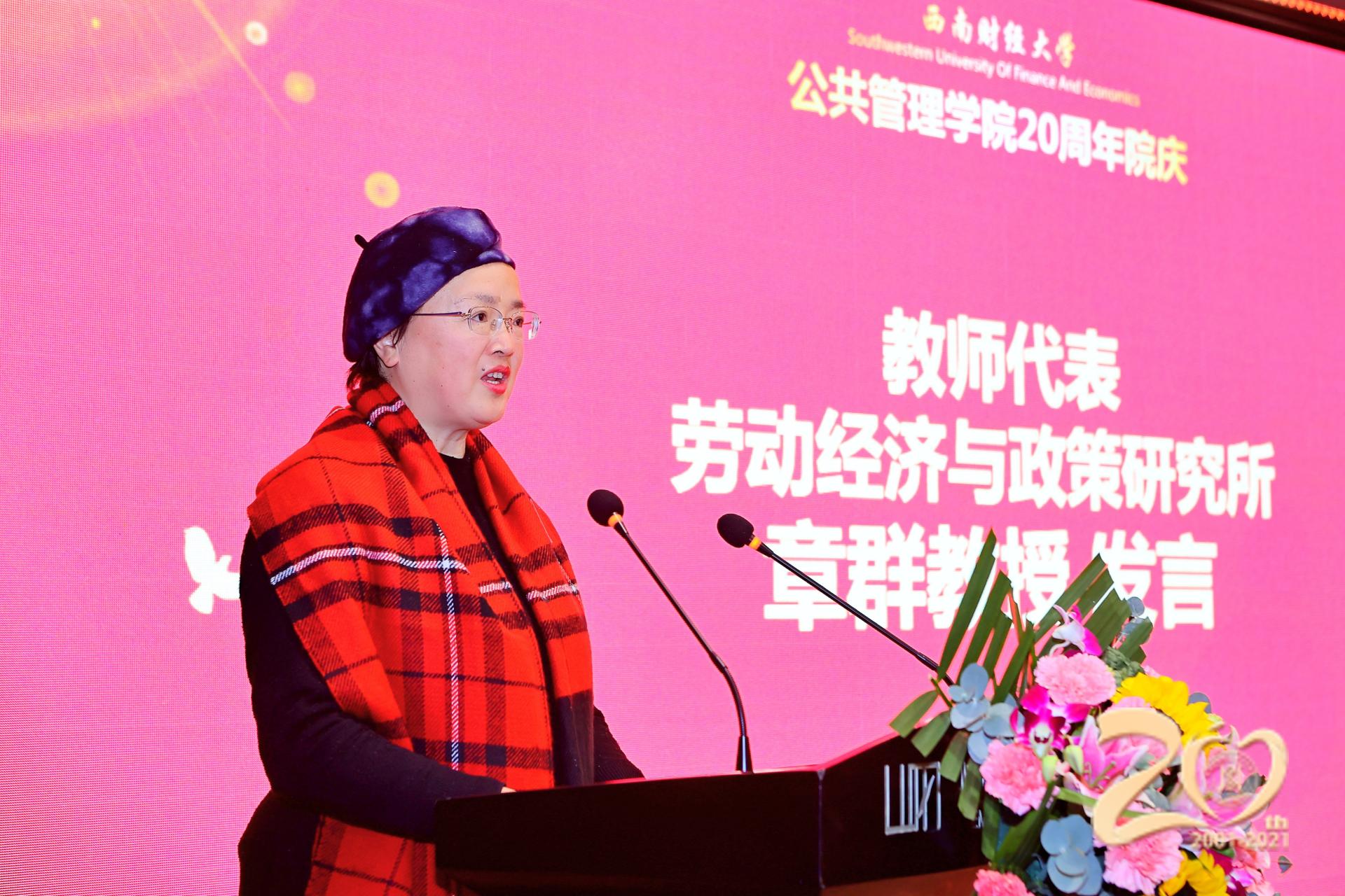 劳动与经济政策研究所章群教授在“不忘初心,筑梦传承”为主题的发言中表示,西财公管人用20年的时间,在学校创建双一流建设的征程中,在全国公共管理学科发展的大局中写下了浓墨重彩的一笔。经过20年的发展,西财公管已经形成了具有自身特色的发展道路。她希望,在面对百年未有之变大变局的当下,要坚定的以习近平新时代中国特色社会主义思想为指导,学好、运用好党百年奋斗的历史经验,为“中国之治”锻造卓越公管人才。