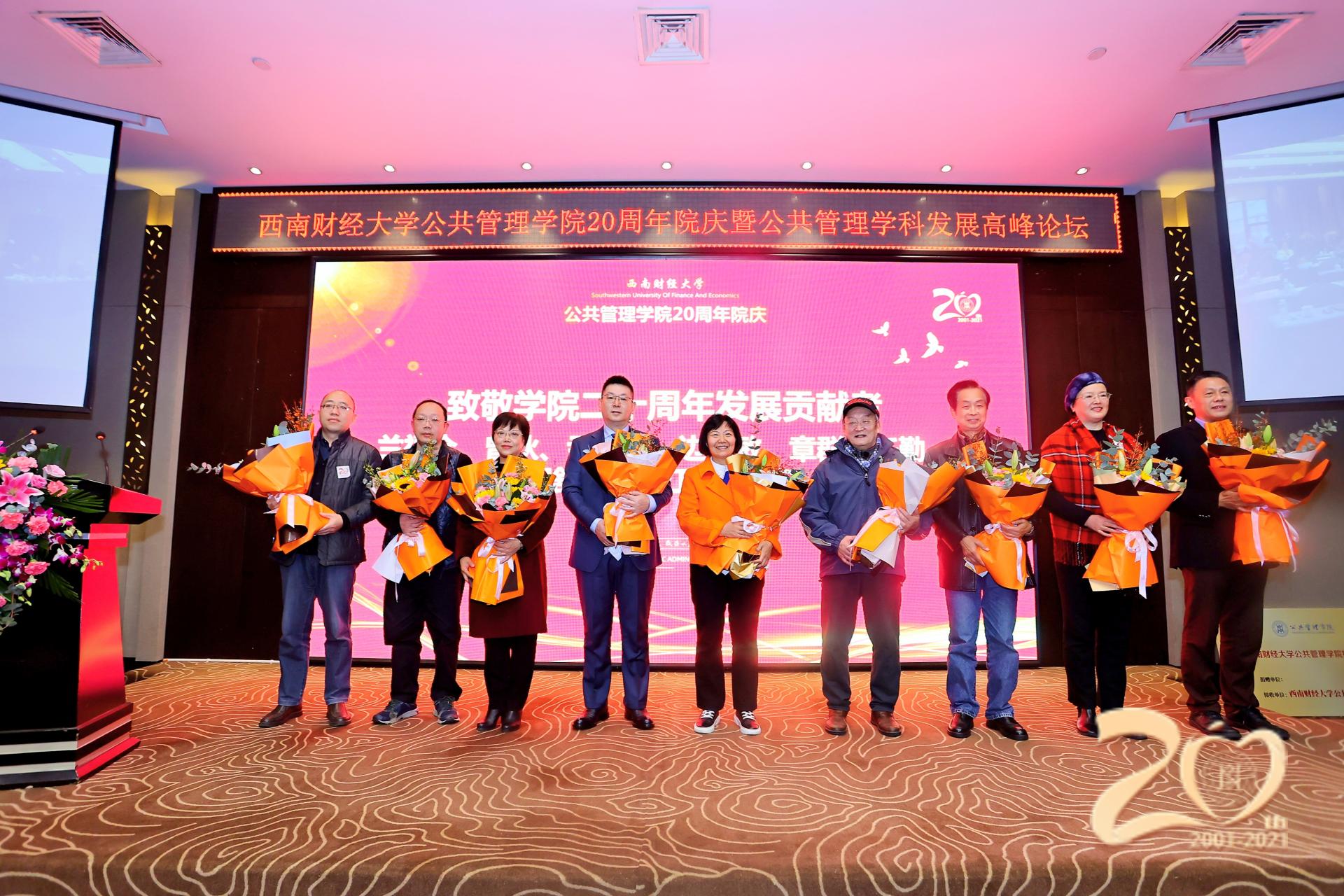 二十年筚路蓝缕,西财公管的每一步发展都离不开一批老教师的信念和坚持,取得的每一个成绩都记载着前行者的汗水与奉献。在学院20周年的庆典上,还特别设计了“致敬特别贡献者”的庆典。在院学子郑重向兰福全、曾狄、尹庆双、边慧敏、章群、任勤、胡苏、赵之江、侯荔江等老教师献上鲜花,以致敬意。