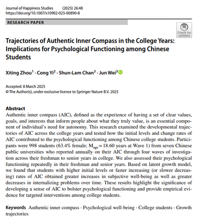 近日,开云教育政策与管理所周溪亭博士及合作团队在积极心理学和幸福研究权威刊物《Journal of Happiness Studies》上发表题为《Trajectories of Authentic Inner Compass in the College Years: Implications for Psychological Functioning among Chinese Students》的研究论文。