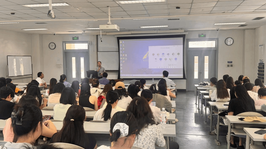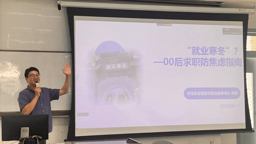 最后,周瑞围绕“就业形势透视”“00后求职优势”等板块展开分享,剖析就业趋势,总结毕业求职路径,聚焦文科求职,从信心塑造、能力提升方面给同学们实用建议,并就学校AI简历和面试系统的使用以及就业中心能提供的就业服务支持进行讲解。