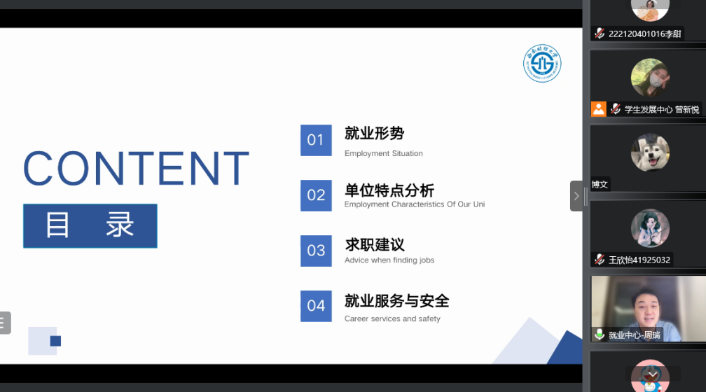 本次活动邀请到学生职业规划与就业指导中心周瑞、李艳两位老师,通过腾讯会议面向全院2023届毕业生做分享交流。