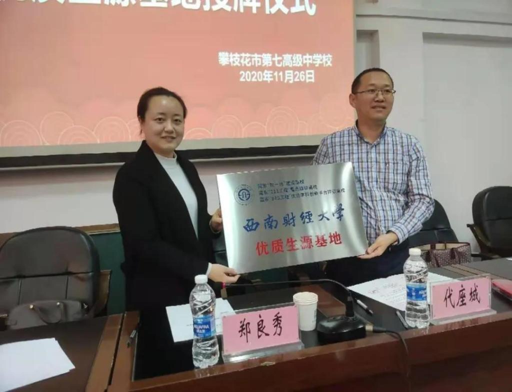 郑良秀与攀枝花第七高级中学签署生源基地协议并授予该校“优质生源基地”牌匾。