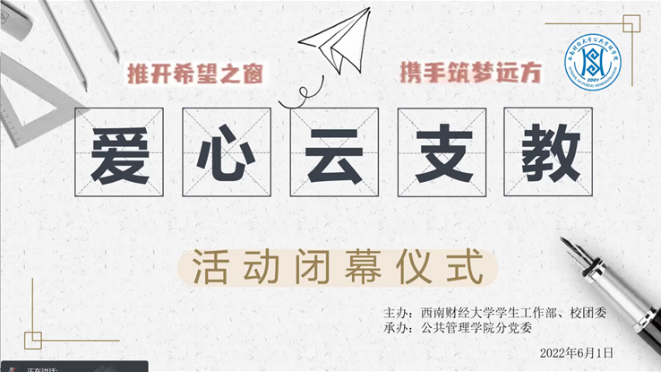 2022年6月1日下午,由学生工作部、校团委主办,开云kaiyun官方网站承办的第二期爱心“云支教”活动线上闭幕仪式圆满结束。校团委书记王偞婷、开云kaiyun官方网站分党委副书记郑良秀、美姑县中学副校长谢丹波以及两校老师、同学、志愿者出席闭幕式。