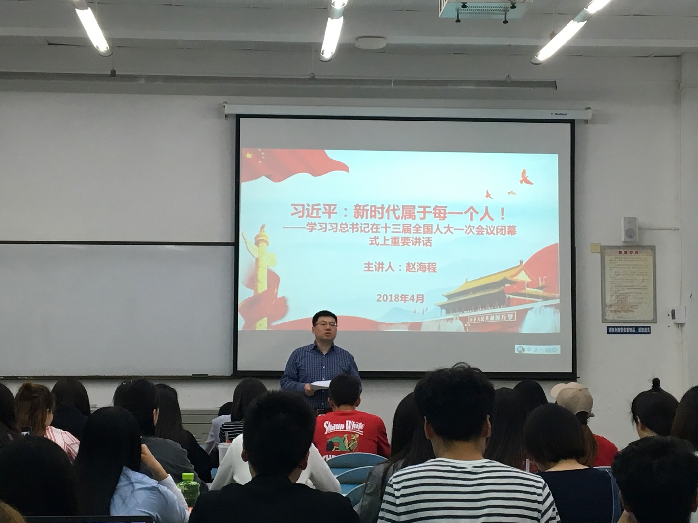 本次专题课上,赵海程着重对同学们学习习近平同志在十三届全国人大一次会议闭幕会上的重要讲话作了辅导。习近平总书记本次重要讲话,深刻诠释了中华民族的伟大民族精神,全面部署了新时代新征程的大政方针,以及对人民的一往深情、对国家的坚定信心、对未来的高瞻远瞩,唤起了亿万人民共同奋斗、共同圆梦的豪迈激情。最后赵海程鼓励在座的各位同学要努力奋斗,紧跟时代步伐,将自身职业生涯规划与民族复兴的伟大事业有机融合,劈波斩浪,扬帆远航。
