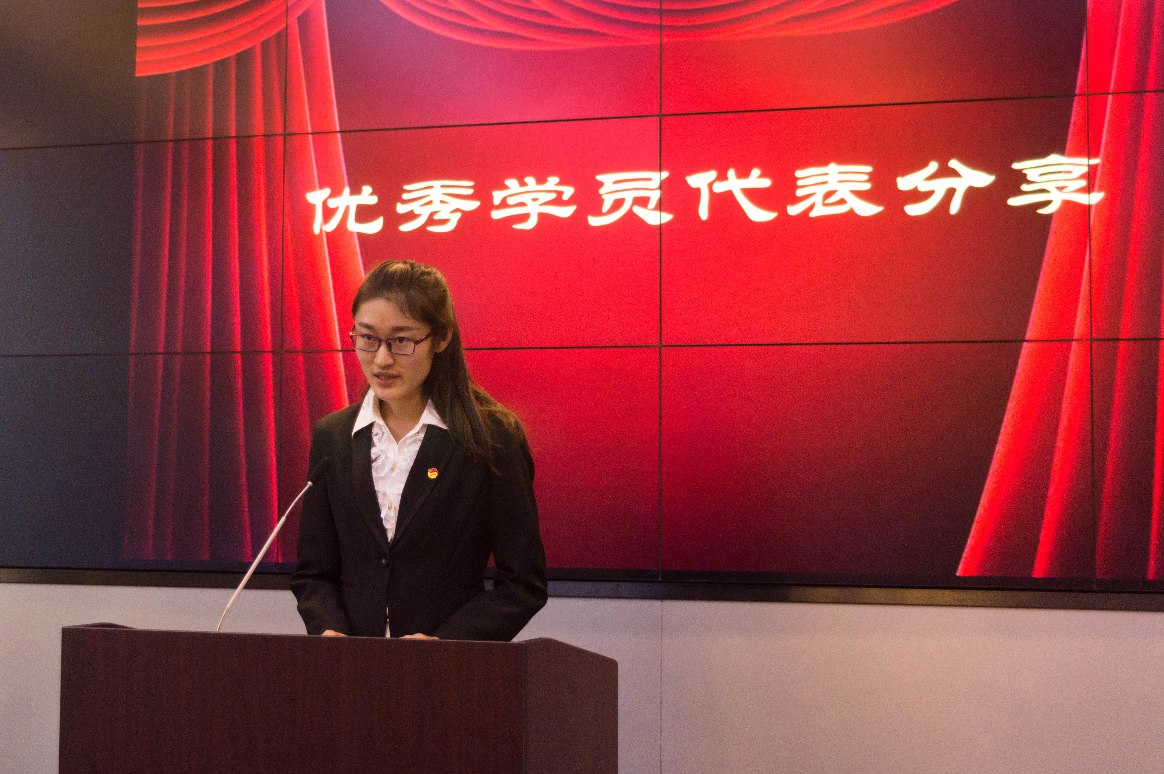 郑书记致辞过后,大家观看了学员的感悟视频,感慨良多。随后,由贾老师宣布优秀团队及优秀学员名单,郑书记颁奖。刘姝琦同学作为优秀学员代表发言。她首先感谢了学院给了她这次难得的机会参与干部培训班的学习,随后就如何在普通学生和学生干部双重身份间自由切换、如何将所学所获用于实践等方面分享了自己的感悟。